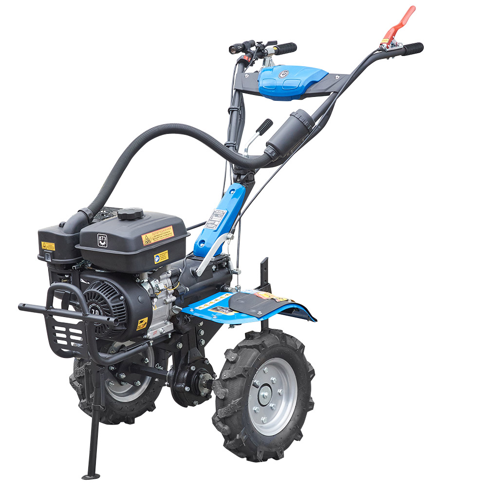 Ручний старт, бензиновий двигун 7 к.с., + 32шт. ножі 4,00-10 колесо, всі важелі металеві. Коробка передач 3 + 1, наявність обгінних розблокіраторів забезпечить маневреність агрегату при транспортуванні і повороті. Дуже простий в експлуатації і конструкції, естетична форма крил, ергономічно вписуються в загальний дизайн агрегату, продумана ергономіка управління мотоблоком, всі органи управління розташовані інтуїтивно з урахуванням максимальної безпеки для оператора, потужний і надійний бензиновий.